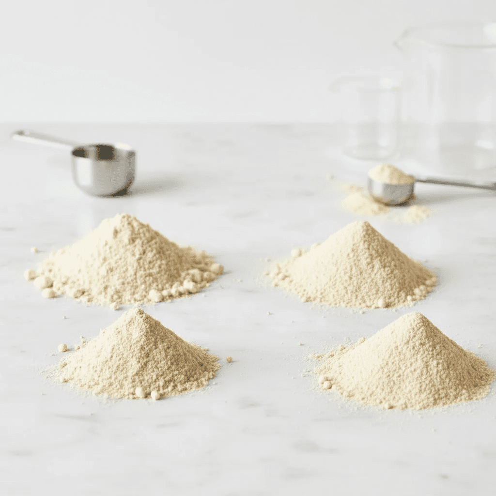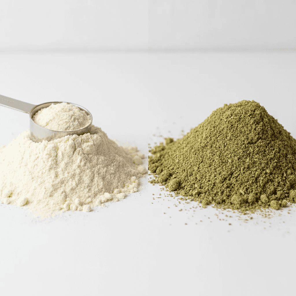 Proteínas en polvo de fuentes animales y vegetales.
