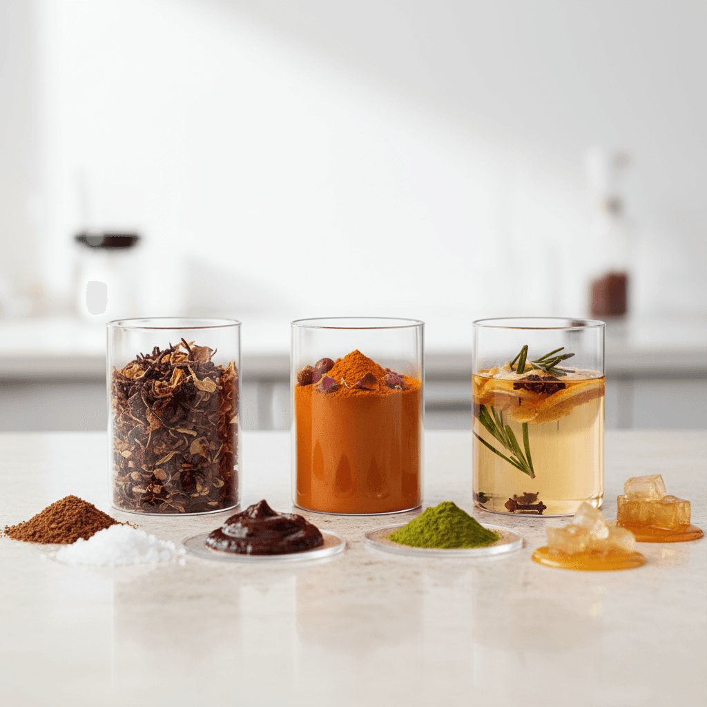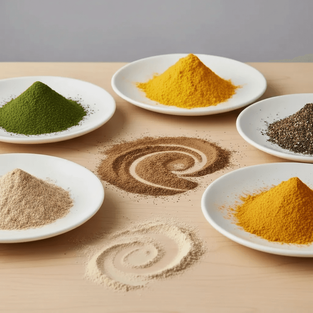 Frutas en polvo y hongos funcionales en polvo.